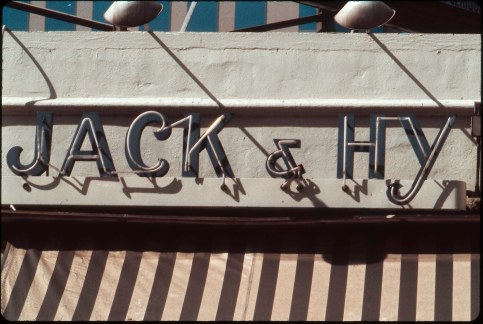 I must have known they would disappear from the landscape because my early fascination with signs led to the purchase of a camera to snap photos of them. Sometimes I took careful symmetrical aim like with Jack & Hy which in my memory was a small juice bar with awning, four chairs and a counter. A straightforward joint that squeezed juices in place of grilling burgers. I pictured it on a small garment district street south of the downtown center. An internet search references such a juice joint on 754 S Olive Street & 8th. It was last inspected by the city health department in 2009 when the lack of hot water and a parade of rats and roaches closed it down.