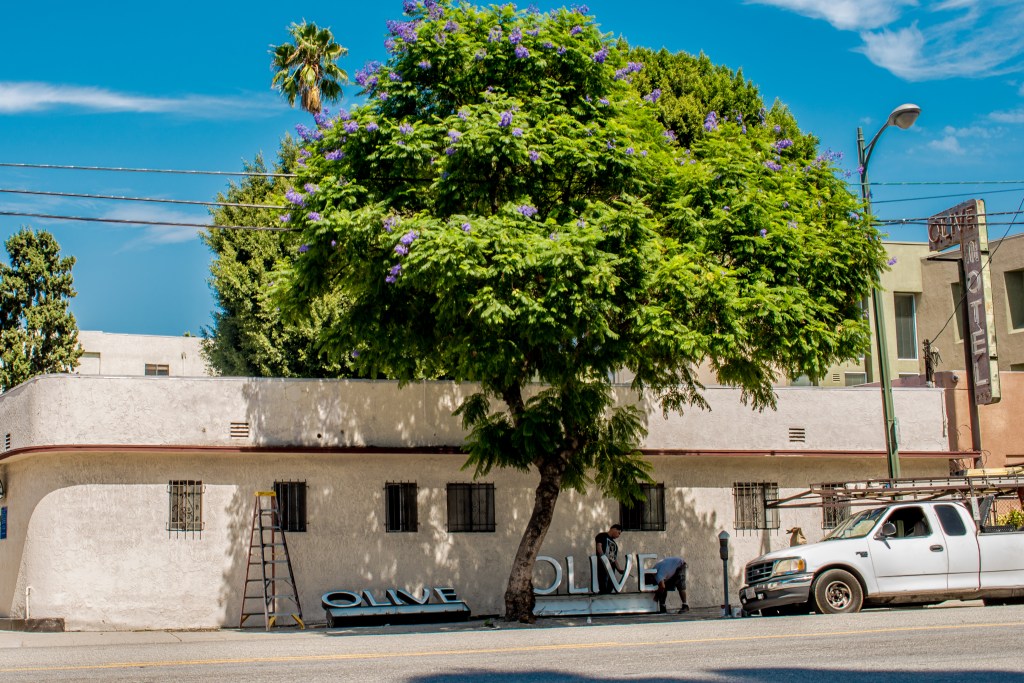 Right next door to Jones Decorating sits the Olive Motel. The motel dates back to 1946. With its “L” shaped layout, rounded corners, flat roof, and classic neon signs, the Streamline Moderne Olive Motel is an iconic holdout amidst the rapidly changing Silverlake landscape.