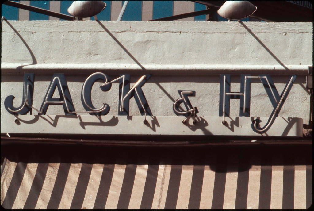 I must have known they would disappear from the landscape because my early fascination with signs led to the purchase of a camera to snap photos of them.  Sometimes I took careful symmetrical aim like with Jack & Hy which in my memory was a small juice bar with awning, four chairs and a counter.  A straightforward joint that squeezed juices in place of grilling burgers.  I pictured it on a small garment district street south of the downtown center.  An internet search references such a juice joint on 754 S Olive Street & 8th.  It was last inspected by the city health department in 2009 when the lack of hot water and a parade of rats and roaches closed it down.